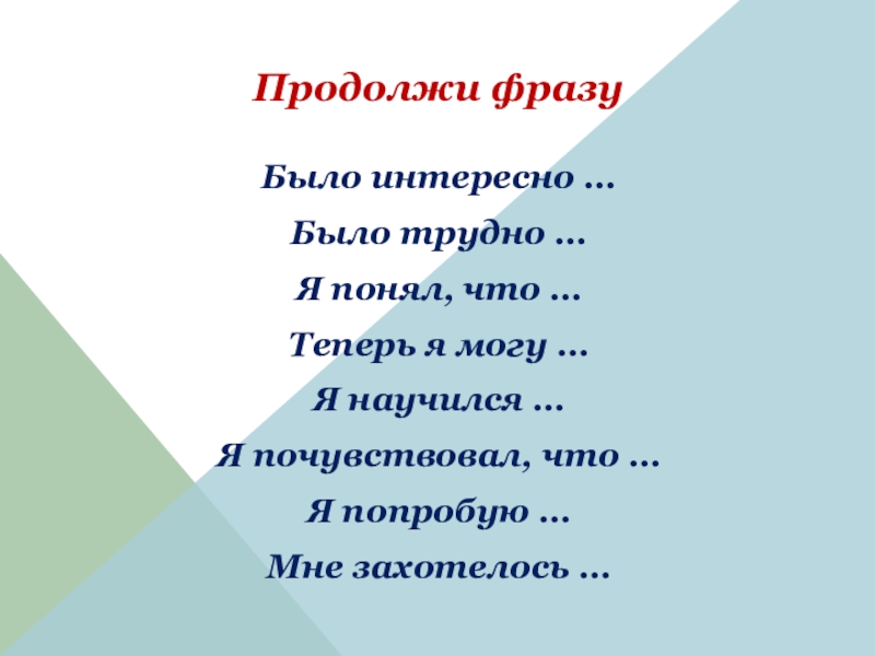 Продолжи фразуБыло интересно …Было трудно …Я понял, что …Теперь я могу …Я научился …Я почувствовал, что …Я