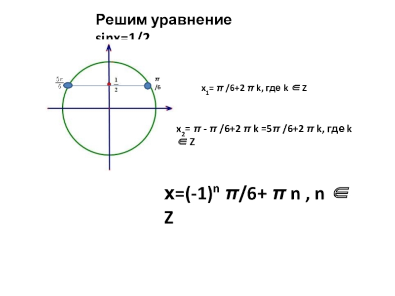 x2= π - π /6+2 π k =5π /6+2 π k, где k ∈ Z