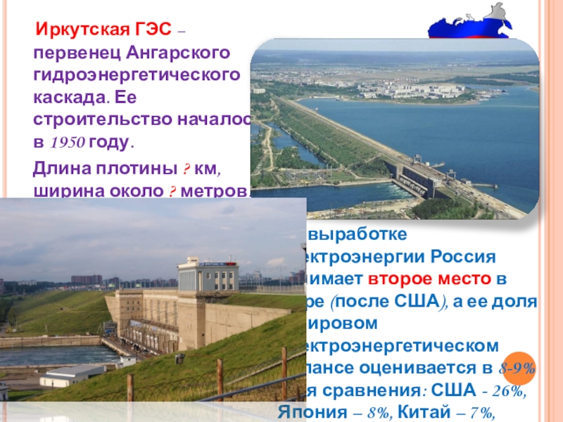По выработке электроэнергии Россия занимает второе место в мире (после США), а ее доля в мировом электроэнергетическом балансе оценивается в 8-9% (для сравнения: США - 26%, Япония – 8%, Китай – 7%, Германия – 5%, Канада – 4%).