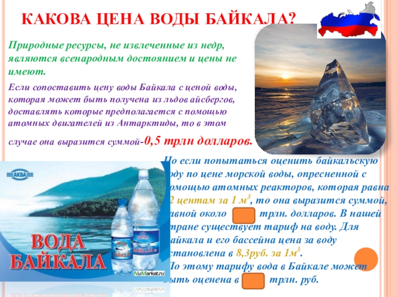 Но если попытаться оценить байкальскую воду по цене морской воды, опресненной с помощью атомных реакторов, которая равна 12 центам за 1 м3, то она выразится суммой, равной около 2,8 трлн. долларов. В нашей стране существует тариф на воду. Для Байкала и его бассейна цена за воду установлена в 8,3руб. за 1м3.