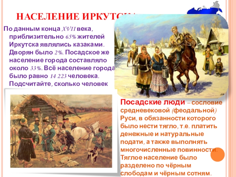 Посадские люди – сословие средневековой (феодальной) Руси, в обязанности которого было нести тягло, т.е. платить денежные и натуральные подати, а также выполнять многочисленные повинности. Тяглое население было разделено по чёрным слободам и чёрным сотням.