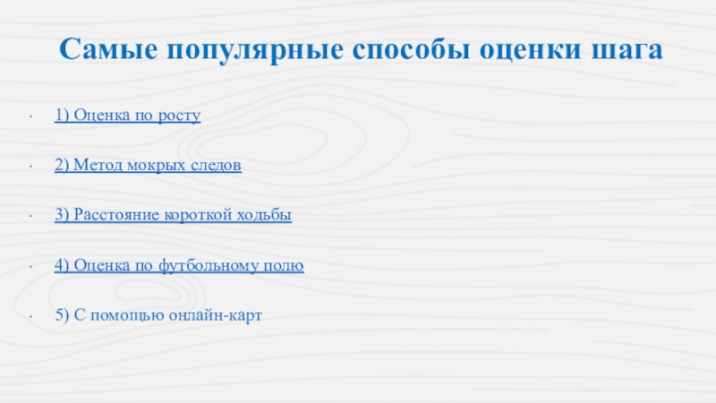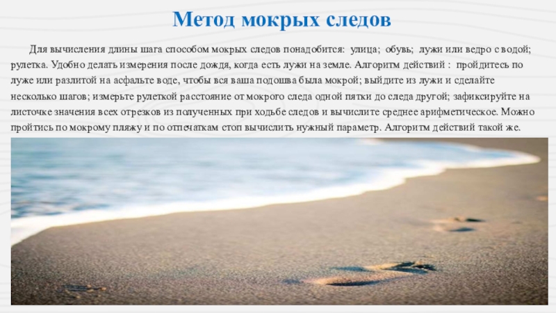 мокрых следов понадобится: улица; обувь; лужи или ведро с водой; рулетка. Удобно делать измерения после дождя, когда есть лужи на земле. Алгоритм действий : пройдитесь по луже или разлитой на асфальте воде, чтобы вся ваша подошва была мокрой; выйдите из лужи и сделайте несколько шагов; измерьте рулеткой расстояние от мокрого следа одной пятки до следа другой; зафиксируйте на листочке значения всех отрезков из полученных при ходьбе следов и вычислите среднее арифметическое. Можно пройтись по мокрому пляжу и по отпечаткам стоп вычислить нужный параметр. Алгоритм действий такой же.