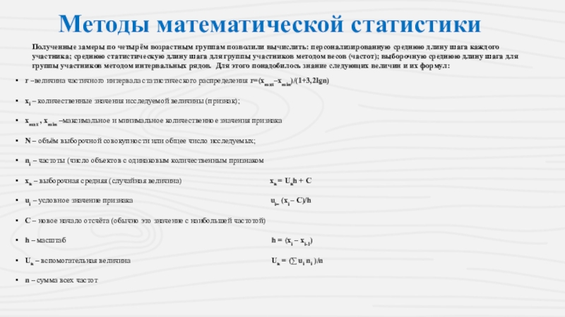 среднюю длину шага каждого участника; среднюю статистическую длину шага для группы участников методом весов (частот); выборочную среднюю длину шага для группы участников методом интервальных рядов. Для этого понадобилось знание следующих величин и их формул: