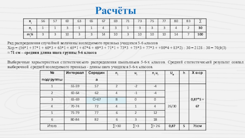+ 57*1 + 60*3 + 63*1 + 65*1 + 67*4 + 69*3 + 71*1 + 73*3 + 75*3 + 77*3 + +80*4 + 83*2) : 30 = 2128 : 30 = 70,9(3) ≈ 71 см – средняя длина шага группы 5-6 класса