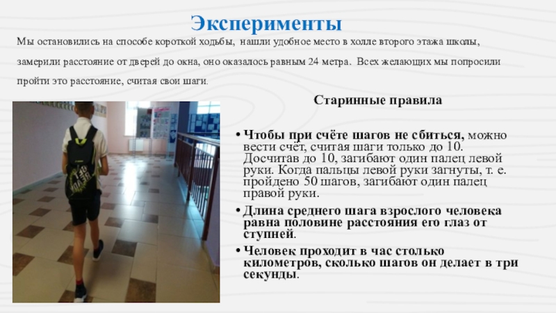 Мы остановились на способе короткой ходьбы, нашли удобное место в холле второго этажа школы, замерили расстояние от дверей до окна, оно оказалось равным 24 метра. Всех желающих мы попросили пройти это расстояние, считая свои шаги.