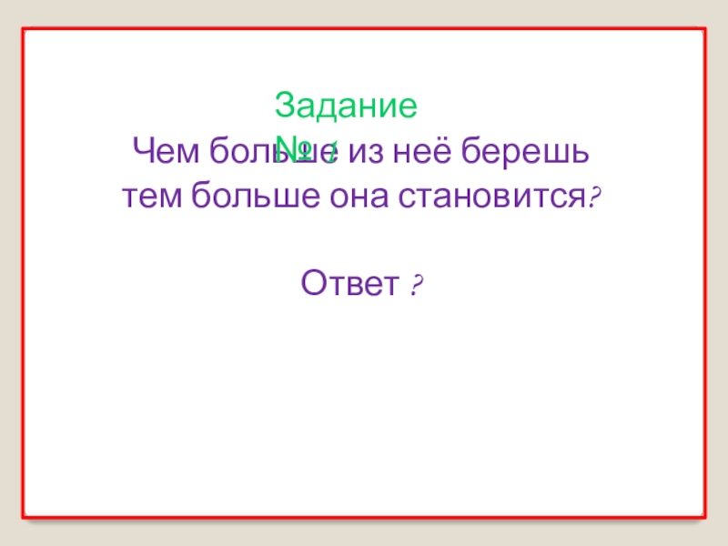 Слайд 11Чем больше из неё берешь тем больше она становится?