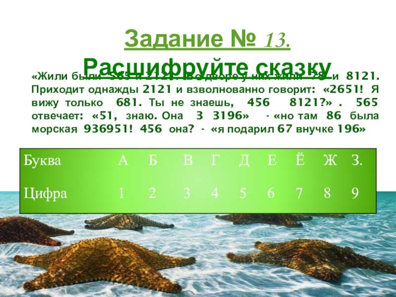 «Жили были 565 и 2121. Во дворе у них жили 78 и 8121. Приходит однажды 2121 и взволнованно говорит: «2651! Я вижу только 681. Ты не знаешь, 456 8121?» . 565 отвечает: «51, знаю. Она 3 3196» - «но там 86 была морская 936951! 456 она? - «я подарил 67 внучке 196»