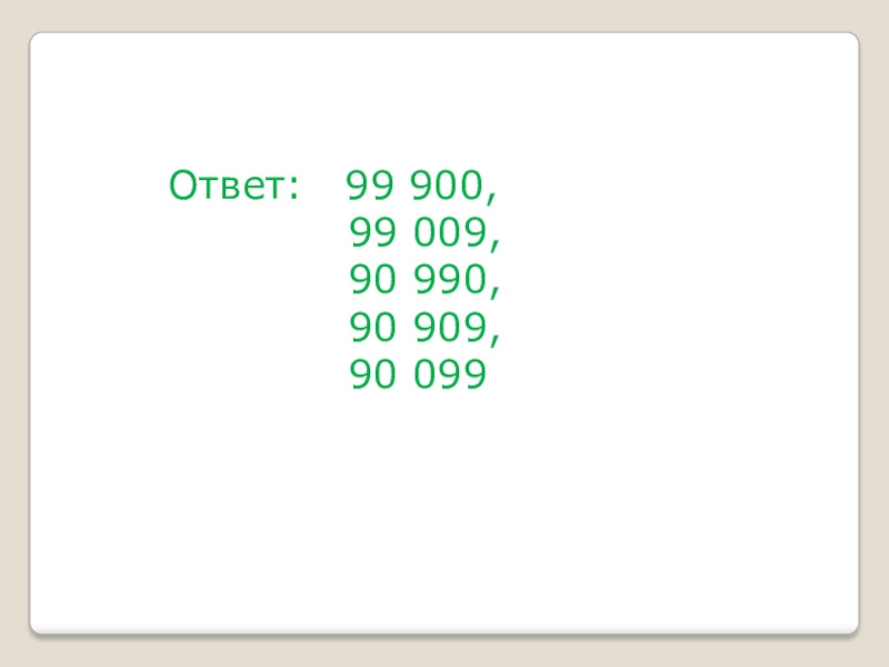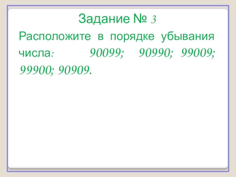 Слайд 14Расположите в порядке убывания числа: 90099; 90990; 99009; 99900;