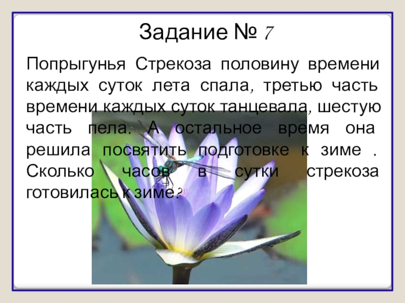 Попрыгунья Стрекоза половину времени каждых суток лета спала, третью