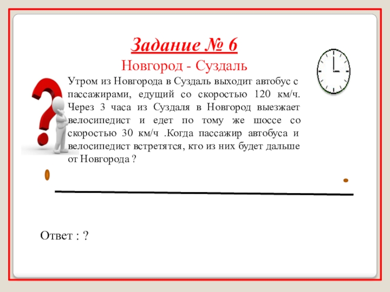 с пассажирами, едущий со скоростью 120 км/ч. Через 3 часа из Суздаля в Новгород выезжает велосипедист и едет по тому же шоссе со скоростью 30 км/ч .Когда пассажир автобуса и велосипедист встретятся, кто из них будет дальше от Новгорода ?