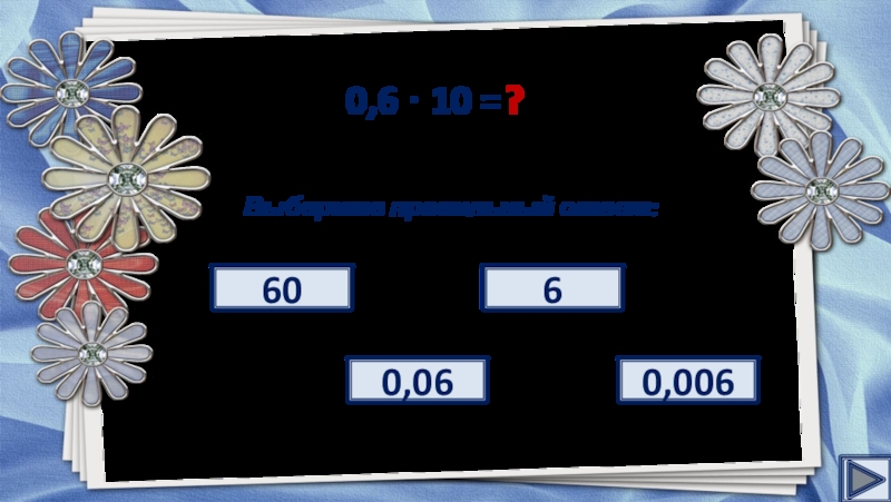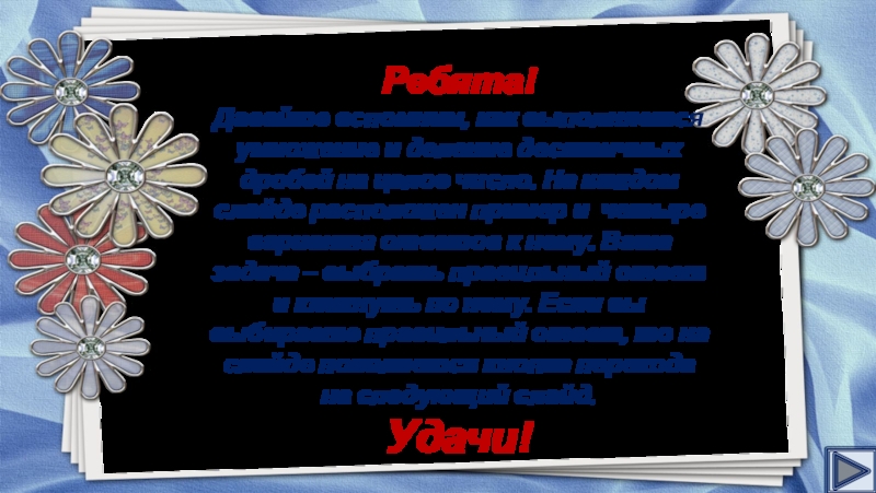 число. На каждом слайде расположен пример и четыре варианта ответов к нему. Ваша задача – выбрать правильный ответ и кликнуть по нему. Если вы выбираете правильный ответ, то на слайде появляется кнопка перехода на следующий слайд.