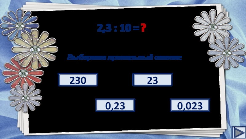 2,3 : 10 = ?Выберите правильный ответ:230,230,023230