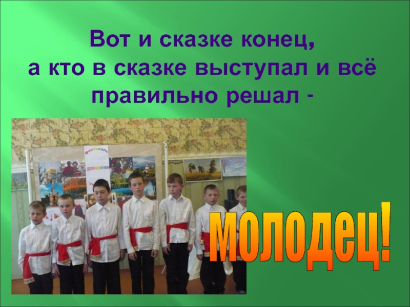 Вот и сказке конец,  а кто в сказке выступал и всё правильно решал -молодец!