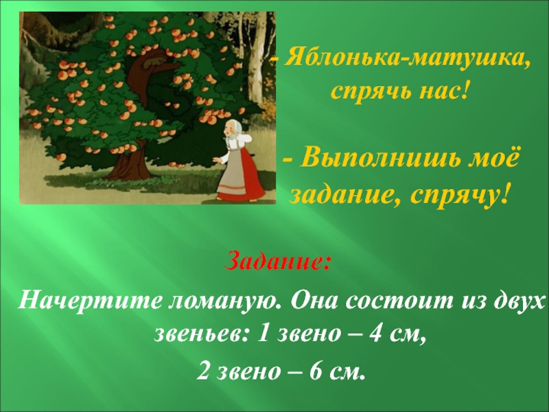 - Яблонька-матушка, спрячь нас!- Выполнишь моё задание, спрячу!Задание:Начертите ломаную. Она состоит из двух звеньев: 1 звено –