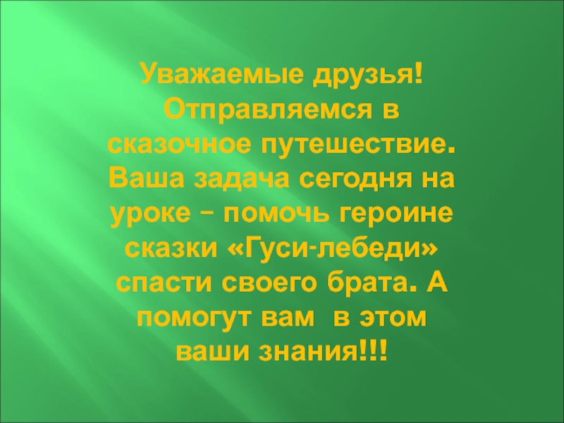 Уважаемые друзья! Отправляемся в сказочное путешествие. Ваша задача сегодня на уроке – помочь героине сказки «Гуси-лебеди» спасти своего брата. А помогут вам в этом ваши знания!!!