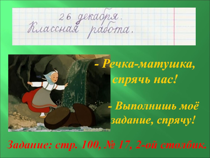 - Речка-матушка, спрячь нас!- Выполнишь моё задание, спрячу!Задание: стр. 100, № 17, 2-ой столбик.