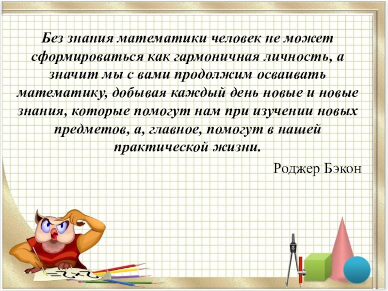 Без знания математики человек не может сформироваться как гармоничная личность, а значит мы с вами продолжим осваивать математику, добывая каждый день новые и новые знания, которые помогут нам при изучении новых предметов, а, главное, помогут в