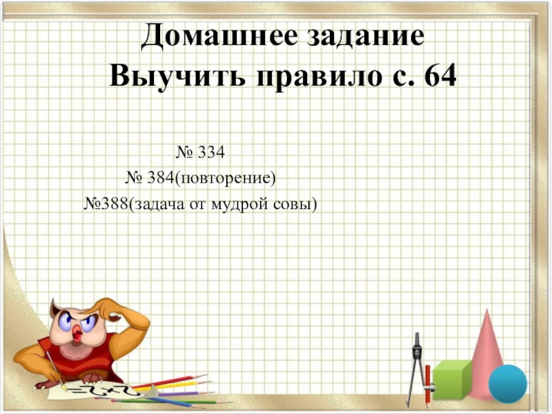 Домашнее задание Выучить правило с. 64  № 334 № 384(повторение)№388(задача от мудрой совы)