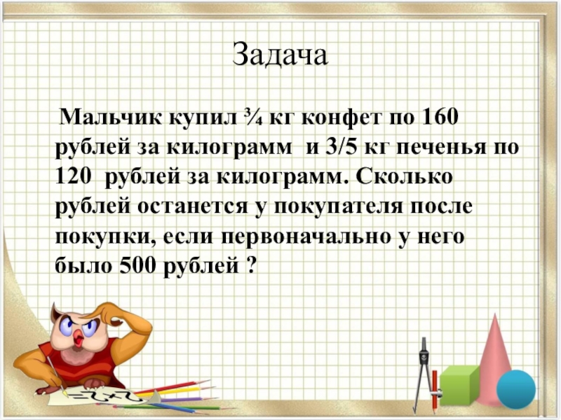 Задача  Мальчик купил ¾ кг конфет по 160 рублей за килограмм и 3/5 кг печенья по