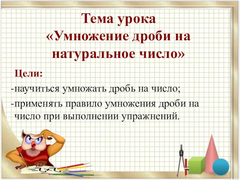 Тема урока  «Умножение дроби на натуральное число»Цели: научиться умножать дробь на число;применять правило умножения дроби на