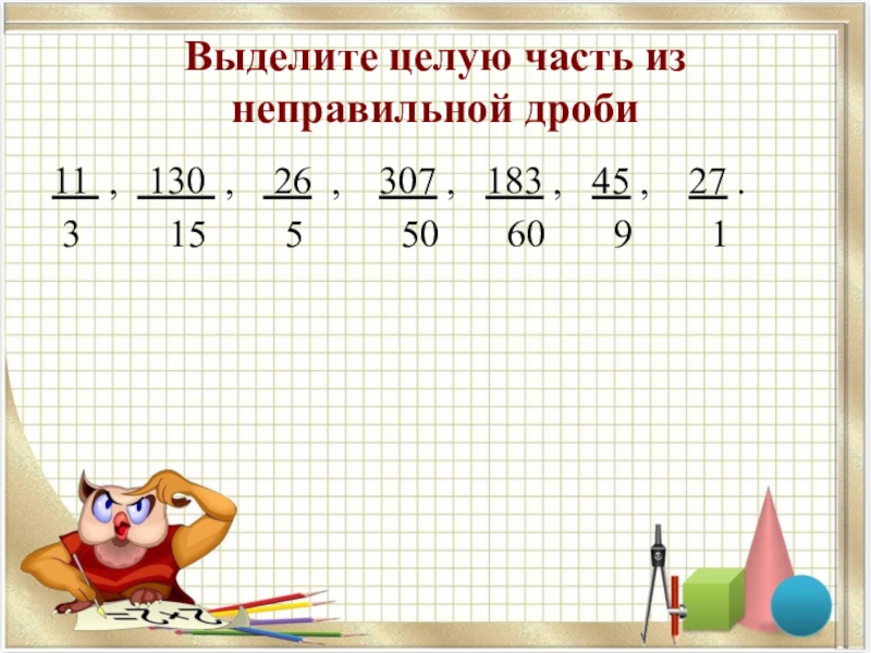 Выделите целую часть из неправильной дроби11 ,  130 ,  26 ,  307 ,