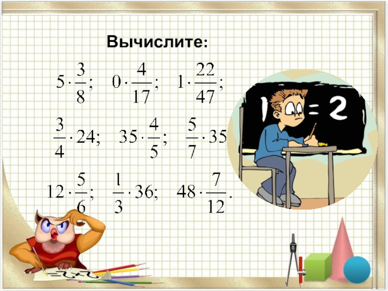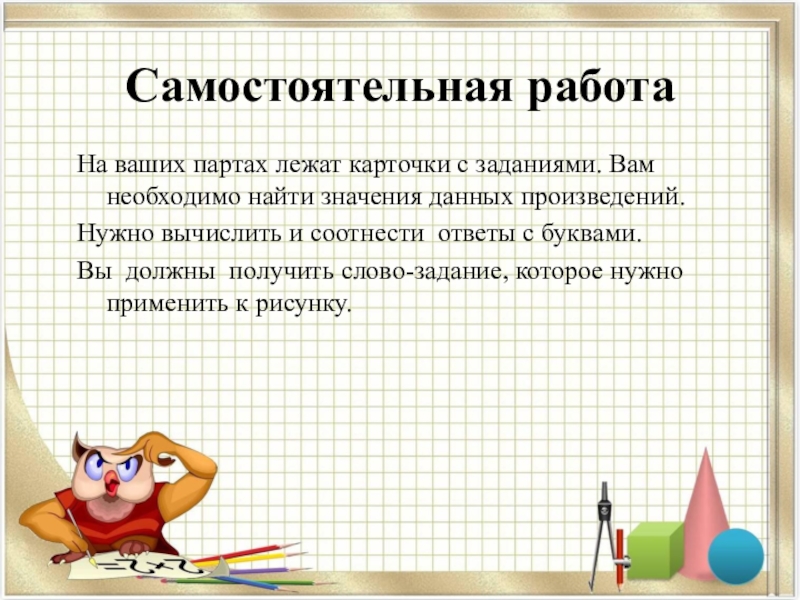 Самостоятельная работаНа ваших партах лежат карточки с заданиями. Вам необходимо найти значения данных произведений.Нужно вычислить и соотнести