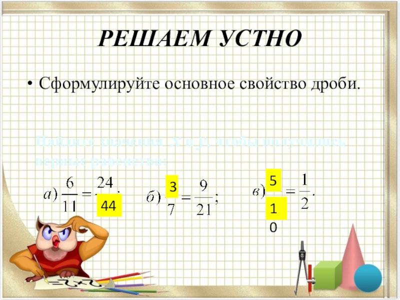 Найдите значения х и у, чтобы получились верные равенства:443510РЕШАЕМ УСТНОСформулируйте основное свойство дроби.