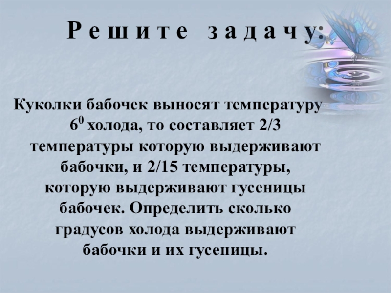 Куколки бабочек выносят температуру 60 холода, то составляет 2/3 температуры которую выдерживают бабочки, и 2/15 температуры, которую выдерживают гусеницы бабочек. Определить сколько градусов холода выдерживают бабочки и их гусеницы.