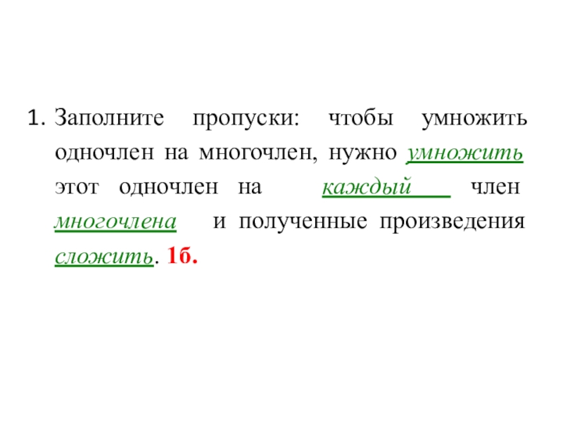 Слайд 17Заполните пропуски: чтобы умножить одночлен на многочлен, нужно умножить этот одночлен