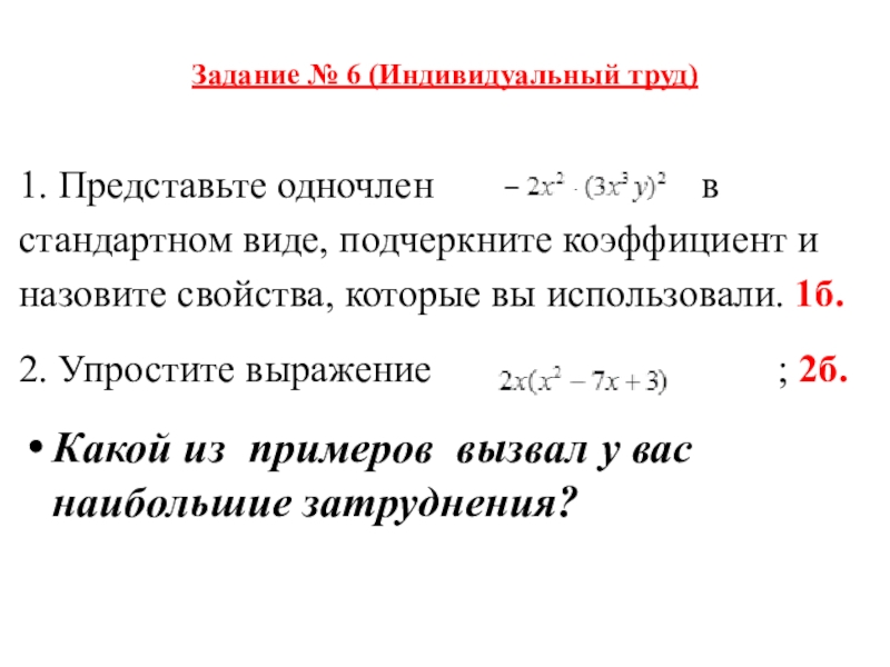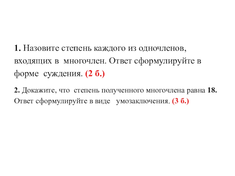 Слайд 81. Назовите степень каждого из одночленов, входящих в многочлен. Ответ сформулируйте