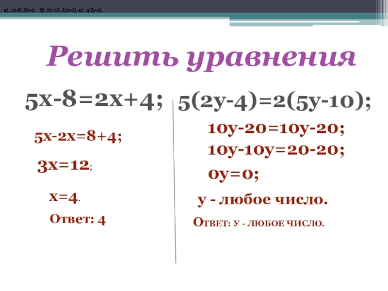 а). 5х-8=2х+4; б). 3х-19=3(х+2); в). 5(2у-4).