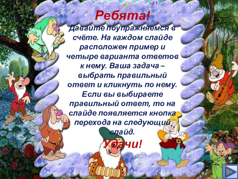 Ребята!Давайте поупражняемся в счёте. На каждом слайде расположен пример и четыре варианта ответов к нему. Ваша задача – выбрать правильный ответ и кликнуть по нему. Если вы выбираете правильный ответ, то на слайде появляется кнопка перехода