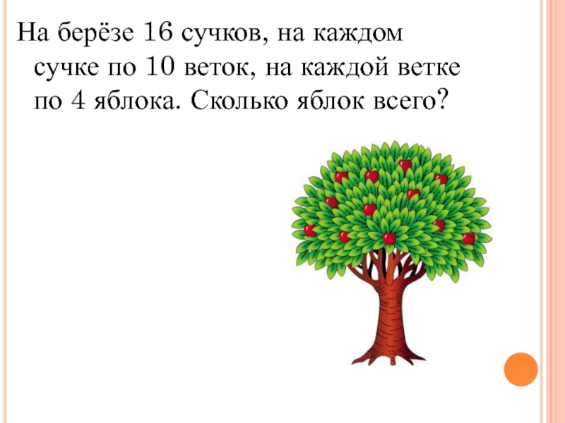 Слайд 7На берёзе 16 сучков, на каждом сучке по 10 веток, на