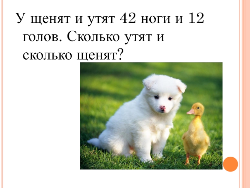 Слайд 9У щенят и утят 42 ноги и 12 голов. Сколько утят