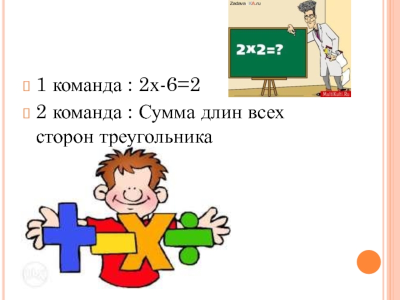 1 команда : 2х-6=2 2 команда : Сумма длин всех сторон треугольника