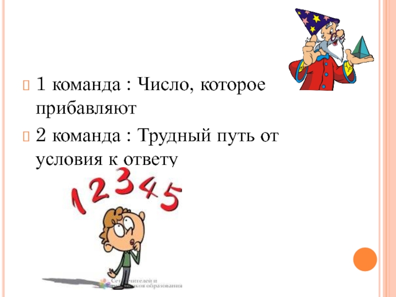 1 команда : Число, которое прибавляют 2 команда : Трудный путь от условия к ответу