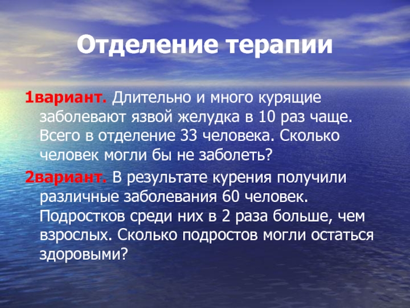 Отделение терапии1вариант. Длительно и много курящие заболевают язвой желудка в 10 раз чаще. Всего в отделение 33