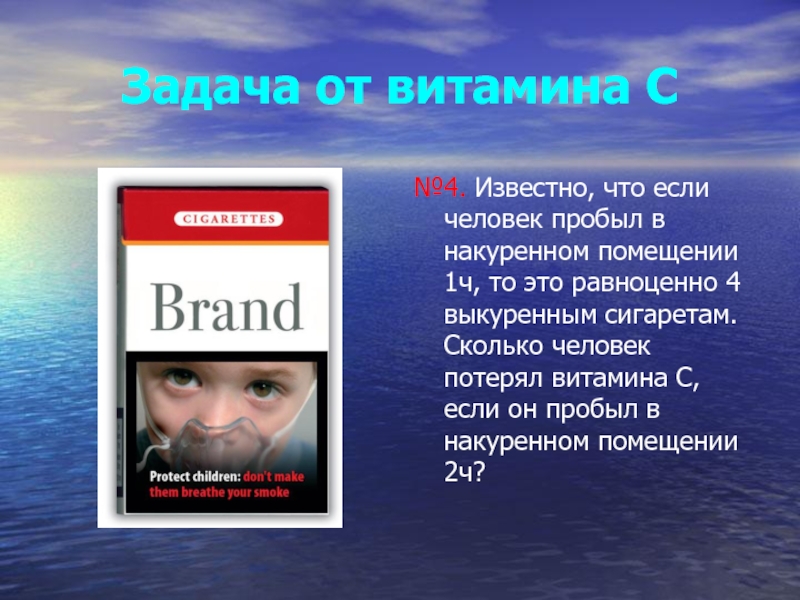 помещении 1ч, то это равноценно 4 выкуренным сигаретам. Сколько человек потерял витамина С, если он пробыл в накуренном помещении 2ч?