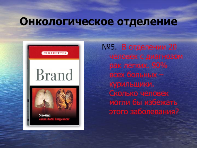 Онкологическое отделение№5. В отделении 20 человек с диагнозом рак легких. 90% всех больных – курильщики. Сколько человек