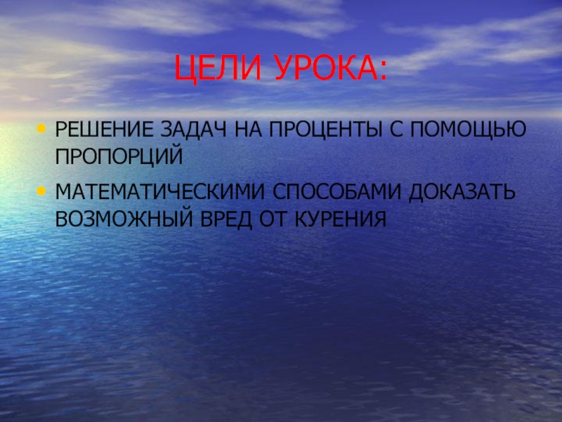 ЦЕЛИ УРОКА:РЕШЕНИЕ ЗАДАЧ НА ПРОЦЕНТЫ С ПОМОЩЬЮ ПРОПОРЦИЙМАТЕМАТИЧЕСКИМИ СПОСОБАМИ ДОКАЗАТЬ ВОЗМОЖНЫЙ ВРЕД ОТ КУРЕНИЯ