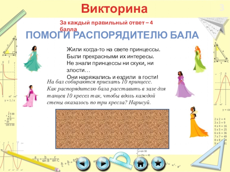 Как распорядителю бала расставить в зале для танцев 10 кресел так, чтобы вдоль каждой стены оказалось по три кресла? Нарисуй.