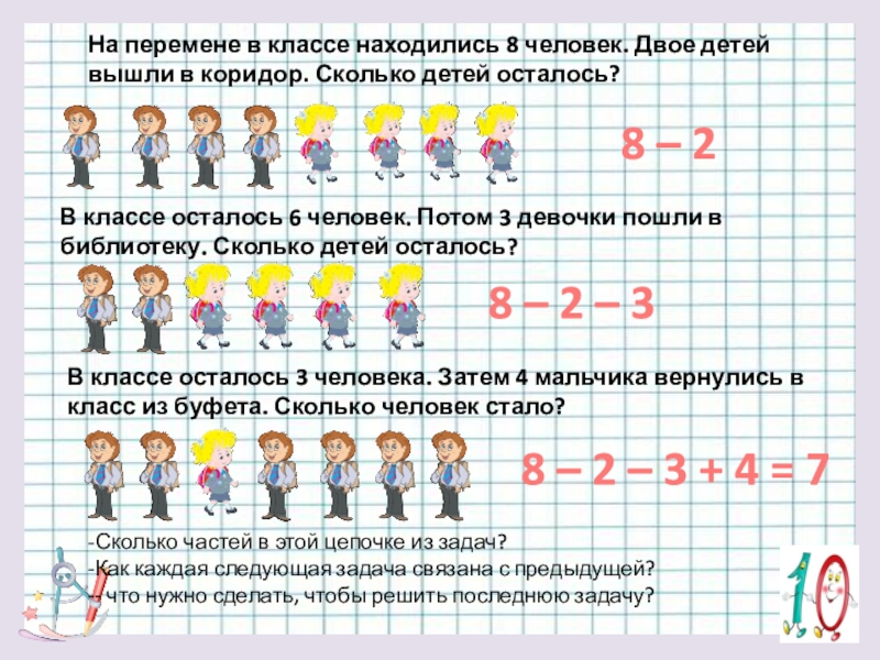 В классе осталось 6 человек. Потом 3 девочки пошли в библиотеку. Сколько детей осталось?