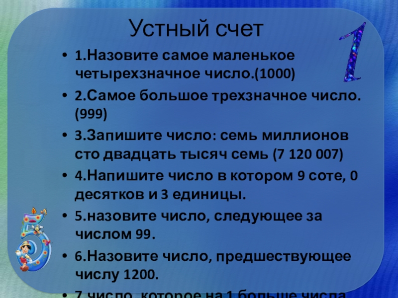 Устный счет1.Назовите самое маленькое четырехзначное число.(1000)2.Самое большое трехзначное число. (999)3.Запишите число: семь миллионов сто двадцать тысяч семь (7 120 007)4.Напишите число в котором 9 соте, 0 десятков и 3 единицы.5.назовите число, следующее за числом 99.6.Назовите число, предшествующее числу