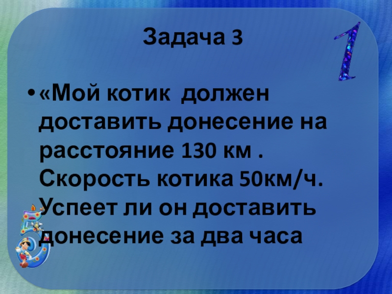 Задача 3«Мой котик должен доставить донесение на расстояние 130 км . Скорость котика 50км/ч. Успеет ли он