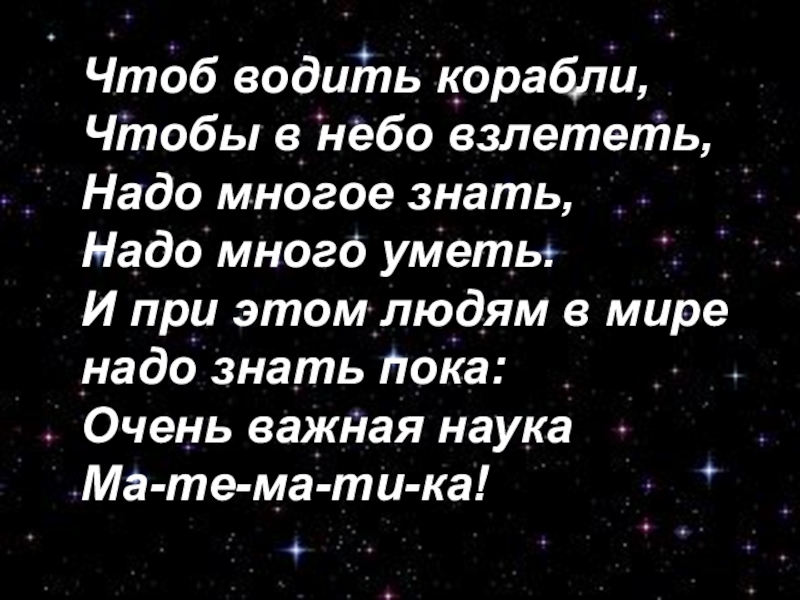 Чтоб водить корабли, Чтобы в небо взлететь, Надо многое знать, Надо много уметь. И при этом людям в мире надо знать пока: Очень важная наука Ма-те-ма-ти-ка!