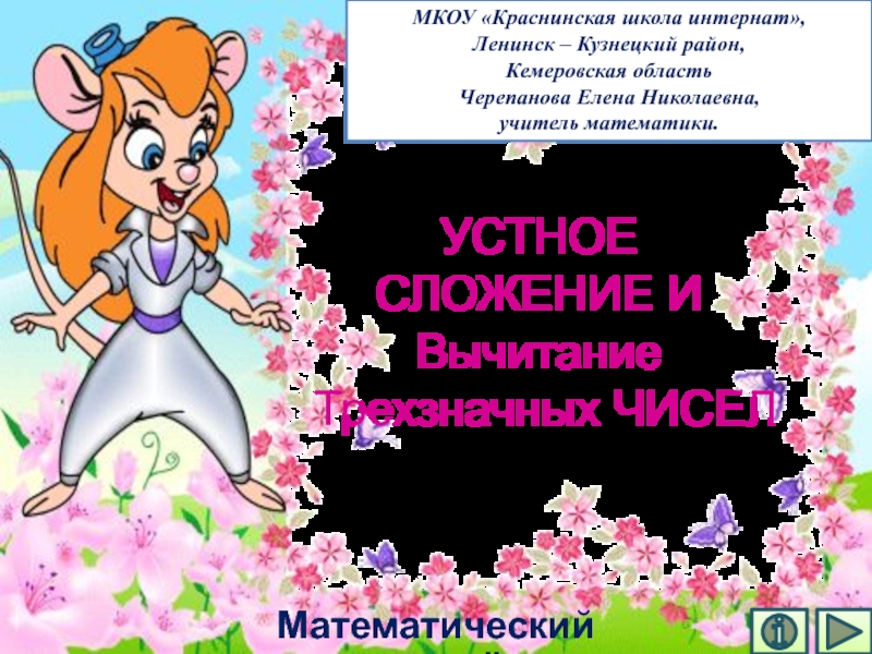 УСТНОЕ СЛОЖЕНИЕ И Вычитание Трехзначных ЧИСЕЛМатематический тренажёрМКОУ «Краснинская школа интернат»,Ленинск – Кузнецкий район,Кемеровская областьЧерепанова Елена Николаевна,учитель математики.