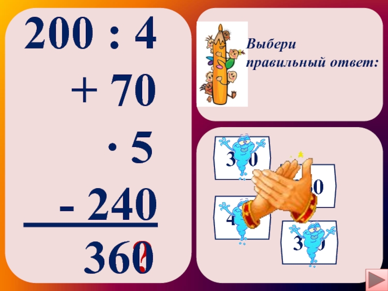 Выбери правильный ответ:200 : 4  + 70    ∙ 5  - 240