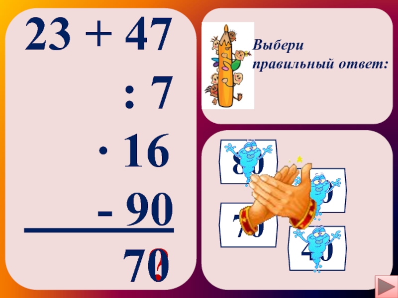 Выбери правильный ответ:23 + 47    : 7   ∙ 16   -