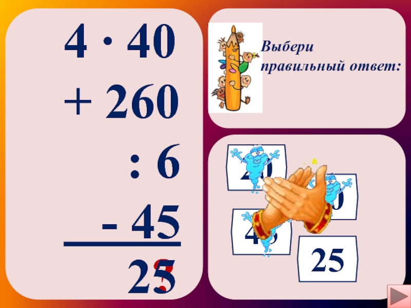 Выбери правильный ответ:4 ∙ 40+ 260   : 6  - 45    ?2520304525