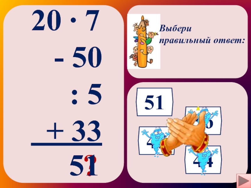 Выбери правильный ответ:20 ∙ 7 - 50 : 5 + 33 ?5156484451